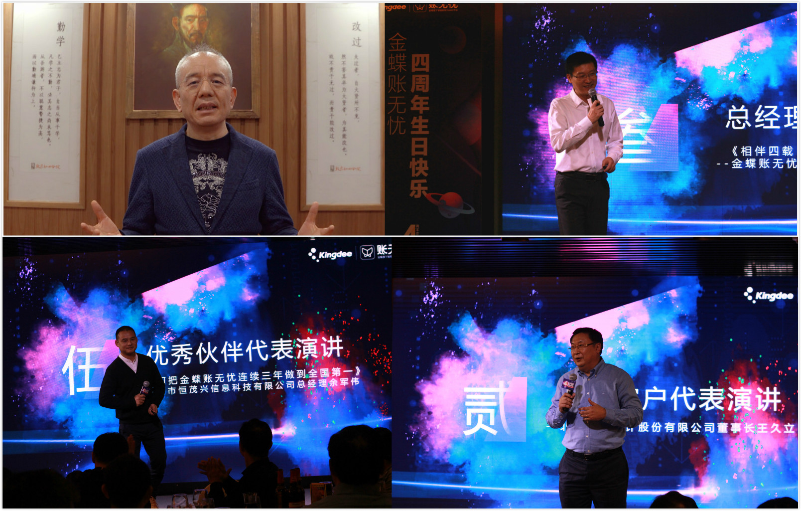 在4周歲生日當(dāng)日,金蝶賬無憂舉辦了主題為“相伴四載,肆放精彩”的品牌4周年慶典,100多位金蝶人與受邀嘉賓共聚一堂。金蝶國際軟件集團(tuán)創(chuàng)始人、董事會(huì)主席徐少春通過視頻的方式為金蝶賬無憂鼓勁與送上祝福:“4年前的冬至,是金蝶賬無憂成立的時(shí)刻,如今4年過去,又恰逢冬至佳節(jié),我們迎來了金蝶賬無憂的4歲生日。4年前我們?cè)f過一句話‘冬天來了,春天還會(huì)遠(yuǎn)嗎’,而今年的經(jīng)濟(jì)形勢(shì)同樣遭遇了冬天,金蝶賬無憂本著讓天下財(cái)稅無憂的初心,為代賬行業(yè)與小微企業(yè)帶來陽光與溫暖,相信春天很快就會(huì)來臨?!贝送?,一眾員工通過創(chuàng)意戲劇、青春歌舞、自制回顧視頻為金蝶賬無憂獻(xiàn)上了美好祝愿。北京華財(cái)會(huì)計(jì)股份有限公司董事長王久立與深圳市恒茂興信息科技有限公司總經(jīng)理余軍偉發(fā)表演講并對(duì)與金蝶賬無憂的堅(jiān)實(shí)合作發(fā)出了期盼,眾人在歡聲笑語中度過了一場難忘的生日慶典。