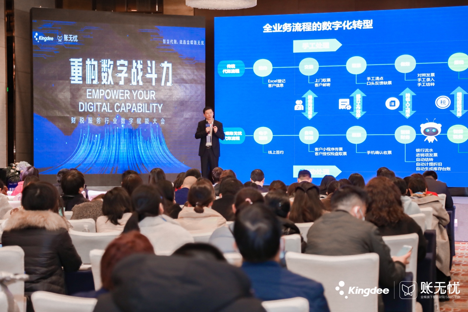 金蝶賬無(wú)憂總經(jīng)理祝錦華發(fā)表了主題為《財(cái)稅服務(wù)行業(yè)如何重構(gòu)數(shù)字戰(zhàn)斗力》的精彩演講。一場(chǎng)疫情讓非接觸性商業(yè)場(chǎng)景全面涌現(xiàn),疫情時(shí)代帶來(lái)的影響將會(huì)延續(xù)明年甚至更遠(yuǎn),但數(shù)字技術(shù)正在加速改變世界,面對(duì)挑戰(zhàn)和機(jī)遇,數(shù)字戰(zhàn)斗力顯得尤為重要?!霸谄髽I(yè)每一個(gè)價(jià)值鏈和場(chǎng)景當(dāng)中,收集、存儲(chǔ)、處理、分析和轉(zhuǎn)換數(shù)據(jù)的能力都將為企業(yè)帶來(lái)額外的力量和競(jìng)爭(zhēng)優(yōu)勢(shì),數(shù)字化后的業(yè)務(wù)將成為企業(yè)的核心競(jìng)爭(zhēng)能力,也將成為企業(yè)的戰(zhàn)斗力。”這就是金蝶集團(tuán)提出數(shù)字戰(zhàn)斗力的理念,祝錦華認(rèn)為數(shù)字戰(zhàn)斗力對(duì)于大部分尚處于傳統(tǒng)作業(yè)模式的財(cái)稅服務(wù)企業(yè)來(lái)說(shuō)尤為重要,財(cái)稅服務(wù)行業(yè)應(yīng)及時(shí)把握機(jī)遇,通過(guò)數(shù)字化引擎打造自身優(yōu)勢(shì),重塑內(nèi)外部流程,以人工智能提效降本,以數(shù)據(jù)驅(qū)動(dòng)提升運(yùn)營(yíng)和增值服務(wù)能力,為客戶打造更好的服務(wù)體驗(yàn),重構(gòu)數(shù)字戰(zhàn)斗力。